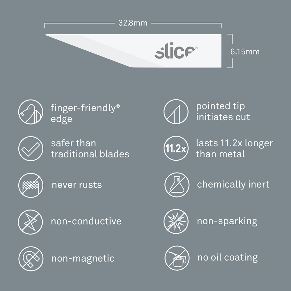 Slice® 10519 Craft Blades (Straight Edge, Pointed Tip) present another option to anyone using Slice craft tools like the Craft Knife, Precision Knife, or 10568 Scalpel. While rounded-tip blades protect against puncture injuries, some materials require a pointed tip to initiate the cut. Enter the 10519 blade, with all the same benefits as our other craft blades, including our safer finger-friendly® edge. This one-sided blade lasts up to 11 times longer than metal and is ideal for intricate, detailed cuts.